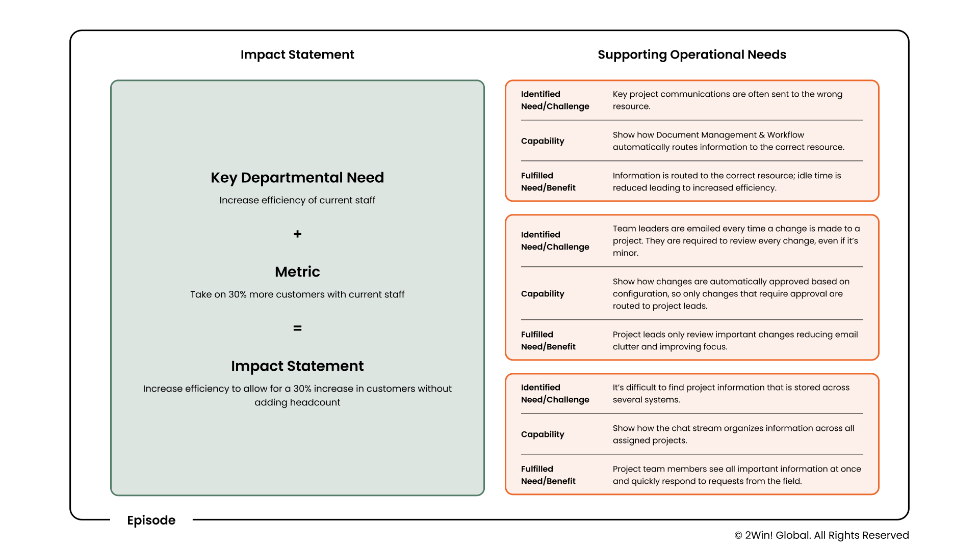 2Win has a framework called the “Value Pyramid” to align benefits with the three primary roles in the audience: operational users, managers/department leaders, and executives: