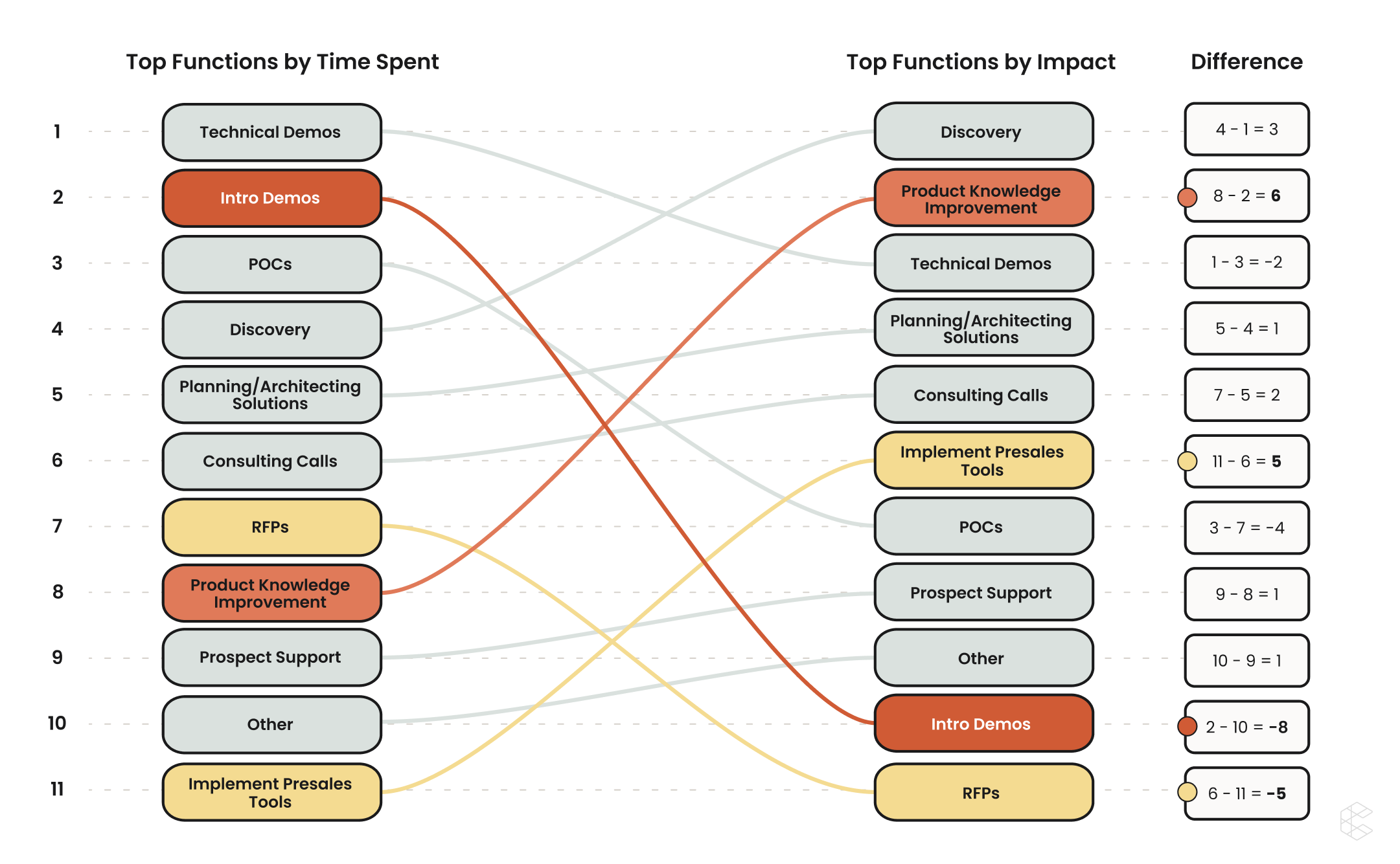 The first step to fixing this problem is to understand the gaps between the tasks that take the most presales time versus those that provide the most value.
