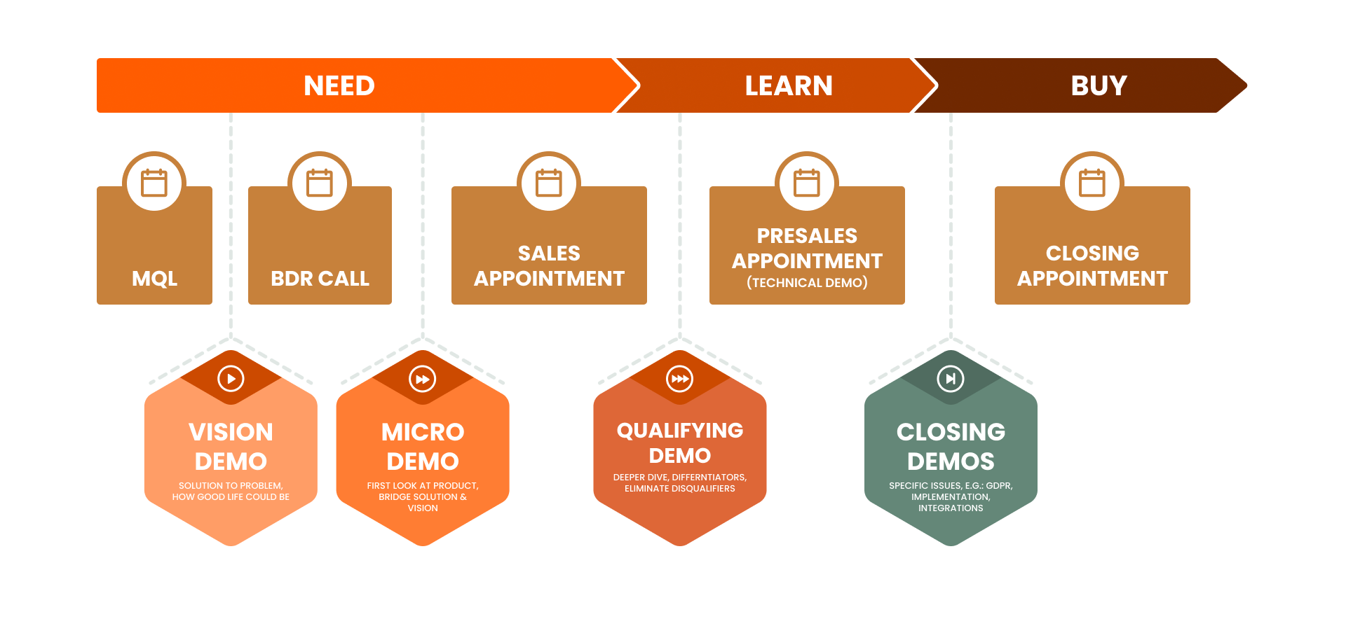 - Qualifying and Discover: Recaps the problem, solution, and benefit. It dives deeper into core functionality and usability in 15 to 20 minutes.