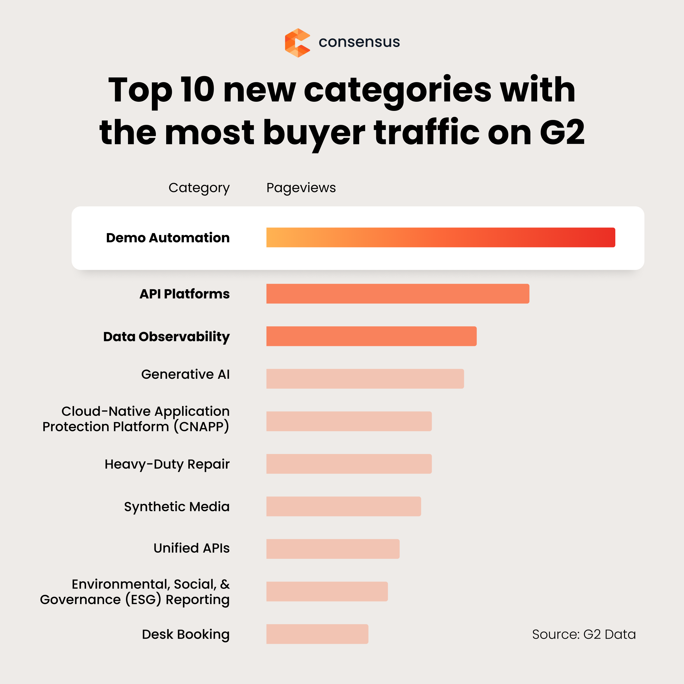The market for interactive demo automation has exploded in the last few years. G2 even stated in their Q4 2023 State of Software report that demo automation was the category with the most buyer traffic on their site above API platforms, data observability, and generative AI.