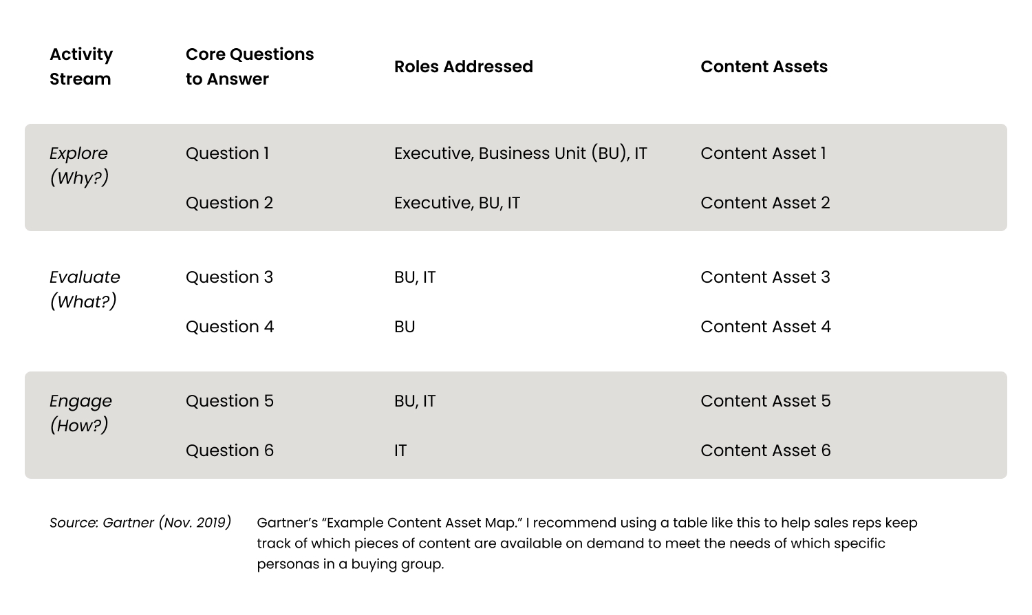 If you feel like you’re the one drowning in content, you can create a system similar to the one Gartner uses for organizing content. Content is organized around three activity streams: Explore (Why?), Evaluate (What?), and Engage (How?).