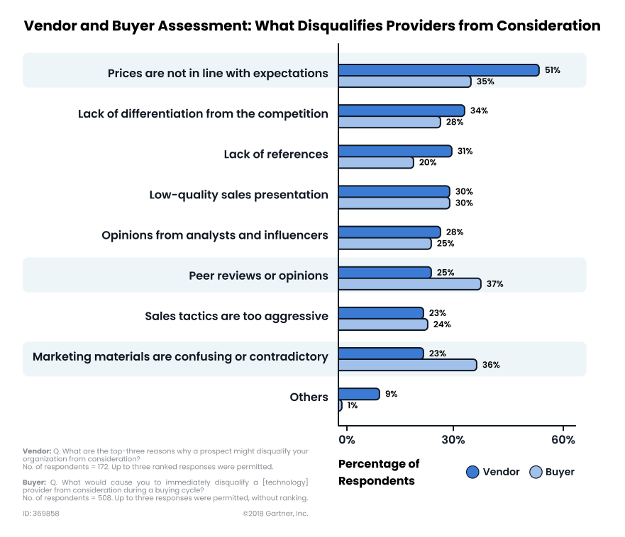 It’s no surprise that buyers may see things differently than you do. There wouldn’t be anything to negotiate if those on both sides of the table saw everything the same way. To explore this idea more specifically, think about the last sale you lost. Did you lose the deal because the price was too high? Was it the lack of differentiation from competitors? Was your sales presentation poor? What was it exactly? Do you think this reason aligns with your prospect’s reasons for not choosing you? It seems to me that the following Gartner graphic shows the stark difference between why buyers disqualify vendors and what vendors think is driving their disqualification.