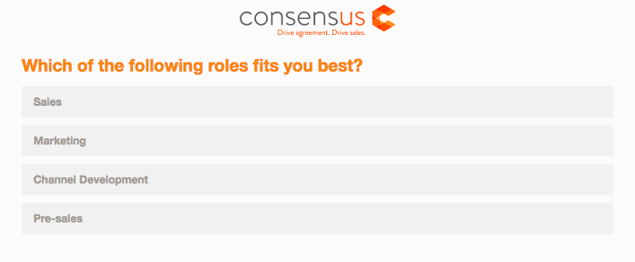 - Advanced Demo – This demo has two layers of personalization. You can first ask a persona based question; what industry they’re in, what role they’re in, or whatever you want to know about your prosecpts. Once answered, Consensus shows them an intro video that applies to their persona. Subsequently taking the path of a standard demo from there.