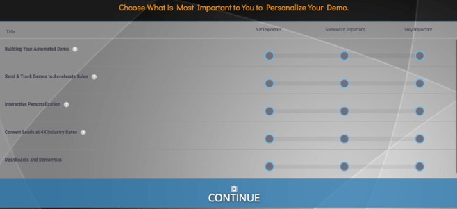- Marketing purpose: The standard demo journey is a great marketing piece on any website, almost anywhere. The time for a standard demo is best when you already know something about the prospect that makes sense for you to bypass the first branching stage. For example, if they have already started down the path of a particular module, it would not make sense to ask which module they are interested in. Instead you begin with an intro with a quick overview of the module, then ask them to personalize the rest of the journey based on features/benefits of that particular module.
