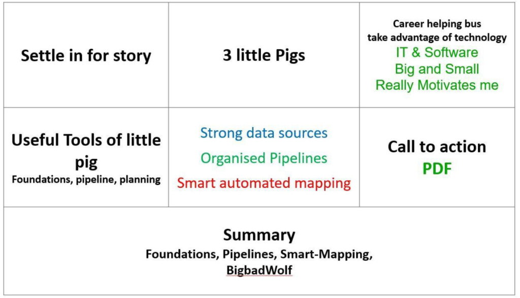 You’ll see the same pattern in the well-known 3 little pigs story, which I used for the presentation below, videoed by a colleague. I also presented this on stage in front of over 100 people at TINTech London, with the same lights off, fireplace style too!