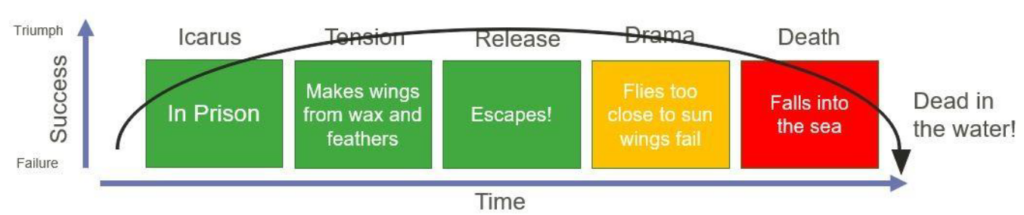 Icarus rose out of prison with wings his father helped him build from feathers and wax. But even after his fathers advice not to fly too close to the sun lest the wax should melt and he would fall, he still did and ended up crashing into the sea. Do NOT finish your presentation here. It’s clear by now, you mustn’t end your story in a fall just like Icarus. The Icarus story arc: