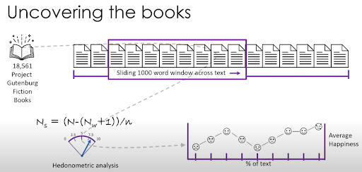 So how can stories be so effective? Enter The University of Vermont’s Computational Story Laboratory (CSL). They took 51,250 Project Guttenberg books, filtered to just the 18,561 fiction books, processed the text through various deep-learning, hedonometric analytic techniques looking at the sentiment of each word, sentence and paragraph, and plotting them on a narrative time graph.