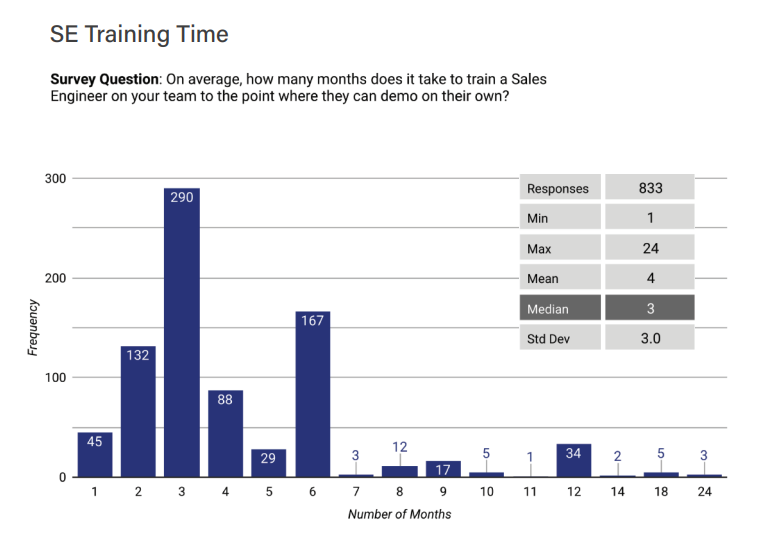 Once the basics of their position have been learned, it can take SEs even longer to build the knowledge base of experience and credibility required to complete their job. There are so many factors that go into how long it takes to have a fully trained SE. Everything from the number of products supported and the complexity of solutions to the average deal size can impact the amount of training SEs require and explains why they are so highly sought after.