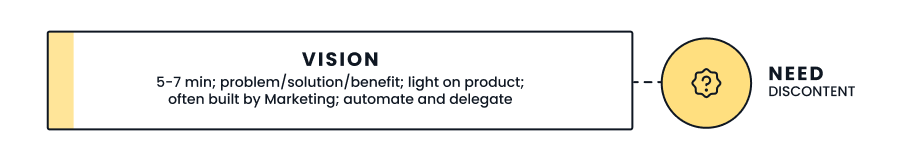 Customers want Vision demos early in the buying journey also known as the “Need” stage. This is when customers realize their current situation is lacking and they’re really starting to feel the pain points of their current processes. They need someone to guide them through a new vision for what their life could be like once they have the ideal solution in place.