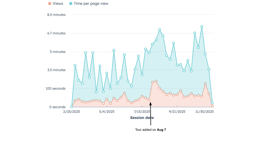 One embedded tour later, 53% of page visitors engaged, 3% booked meetings, time on page jumped by nearly a full minute, bounce dropped, and our search impressions more than doubled.