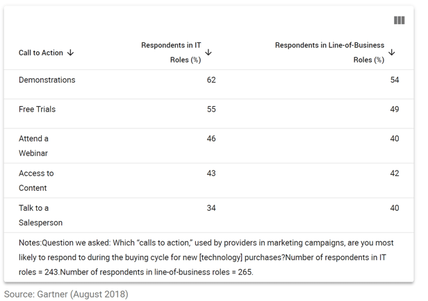 When you are researching a new technology purchase, what do you want to see as quickly as possible? A demo. So does everyone else apparently. Recent research from Gartner shows that what buyers want most of all is a demo. IT buyers reported being likely to respond to a call to action to watch a demo 62% of the time. Non-IT buyers are surprisingly only a few percentage points below that at 54%. Both are higher than all other calls to action.