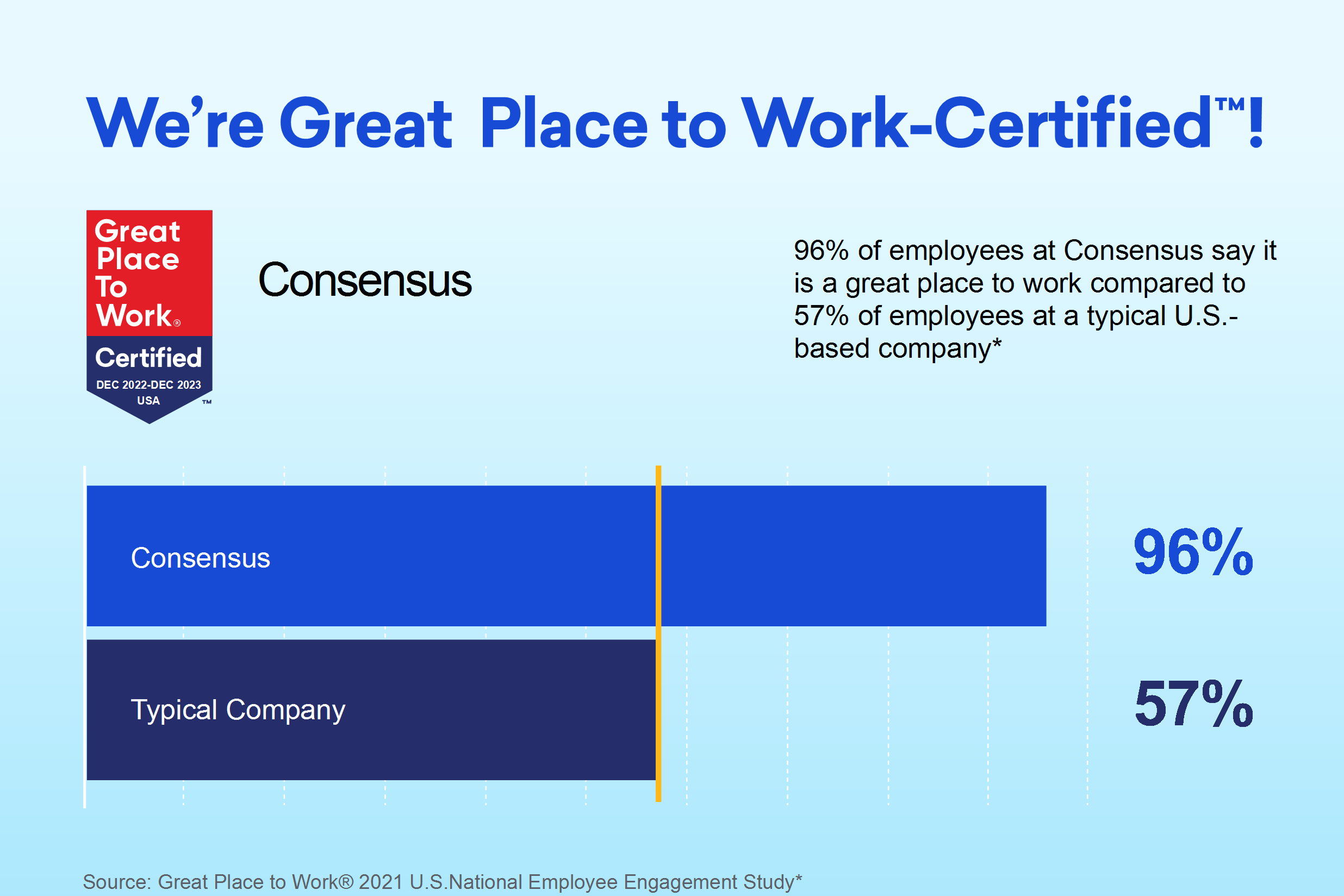 “Great Place to Work Certification™ isn’t something that comes easily – it takes ongoing dedication to the employee experience,” said Sarah Lewis-Kulin, vice president of global recognition at Great Place to Work. “It’s the only official recognition determined by employees’ real-time reports of their company culture. Earning this designation means that Consensus is one of the best companies to work for in the country.”