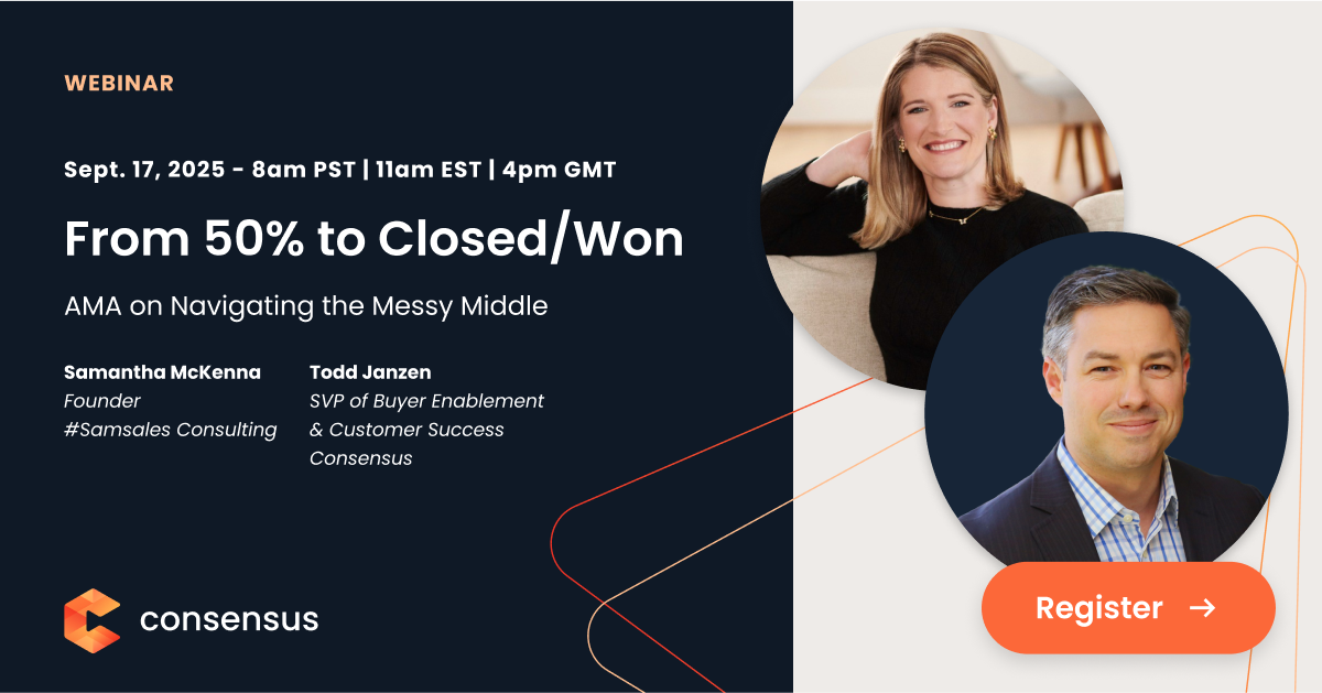 Join Todd Janzen, SVP of Buyer Enablement & Customer Success at Consensus, and Samantha McKenna, founder of #samsales, for an AMA-style session where they reveal how to sell in the gaps: turning stalled 50% deals into closed-won opportunities. Learn how leading teams are leveraging product experiences, automation, and buyer education to accelerate deals, so that when reps finally step in, buyers are already leaning forward.